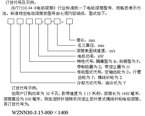 (1).因目前外裝式電動(dòng)滾筒尚未制定相關(guān)行業(yè)標(biāo)準(zhǔn),本廠將該型號(hào)電動(dòng)滾筒首位代號(hào)用W(“外裝”的首位漢語拼音)表示。外裝式電動(dòng)滾筒外置電機(jī)可分為立式電機(jī)和臥式電機(jī),用戶訂購(gòu)時(shí)請(qǐng)加以說明;